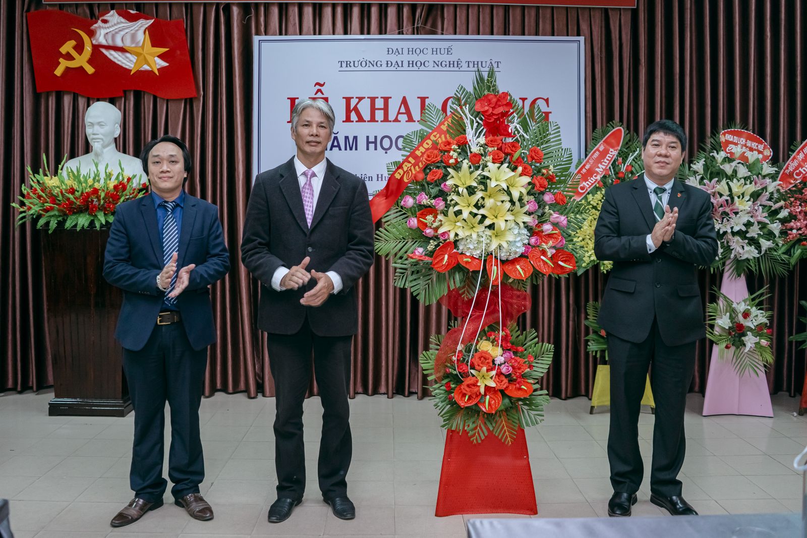 PGS.TS. Huỳnh Văn Chương, Bí thư Đảng ủy, Phó Giám đốc ĐH Huế tặng hoa chúc mừng Trường ĐH Nghệ thuật