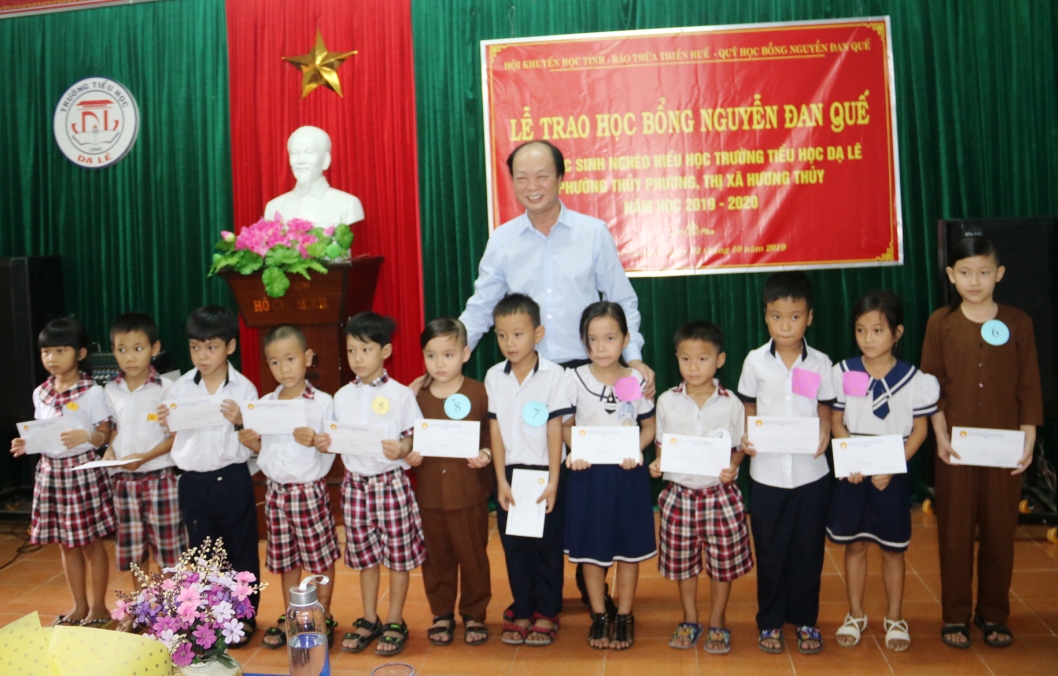 Chiều cùng ngày, học bổng Nguyễn Đan Quế tiếp tục được trao cho 50 học sinh có hoàn cảnh khó khăn, có thành tích tốt trong học tập ở huyện Phú Lộc.