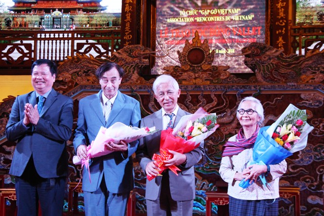 Phó Chủ tịch UBND tỉnh Nguyễn Dung tặng hoa cho GS Odon Vallet và vợ chồng GS Trần Thanh Vân và Lê Kim Ngọc