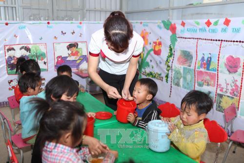 Chăm sóc các trẻ trường Mầm non tại Bản San Cha, xã Dào San, huyện Phong Thổ. Ảnh: Quý Trung/TTXVN