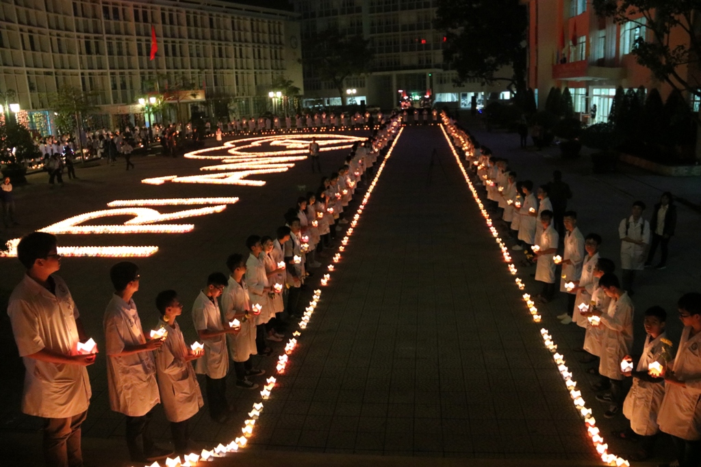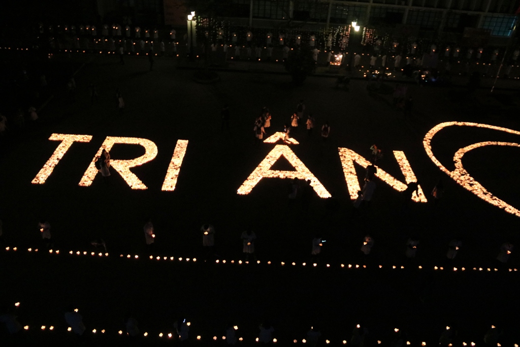 Sinh viên xếp hoa đăng thành dòng chữ tri ân trên sân trường (Ảnh chụp từ góc cao)