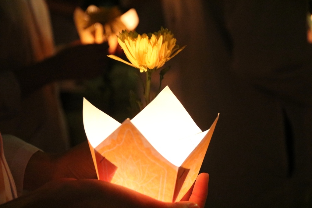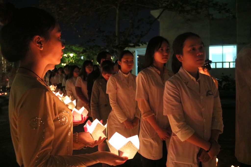 Hoa cúc và đèn hoa đăng được các sinh viên chuẩn bị sẵn trên tay