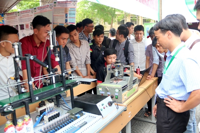 Các cán bộ, sinh viên tham quan một gian hàng tại triển lãm sản phẩm khoa học - công nghệ