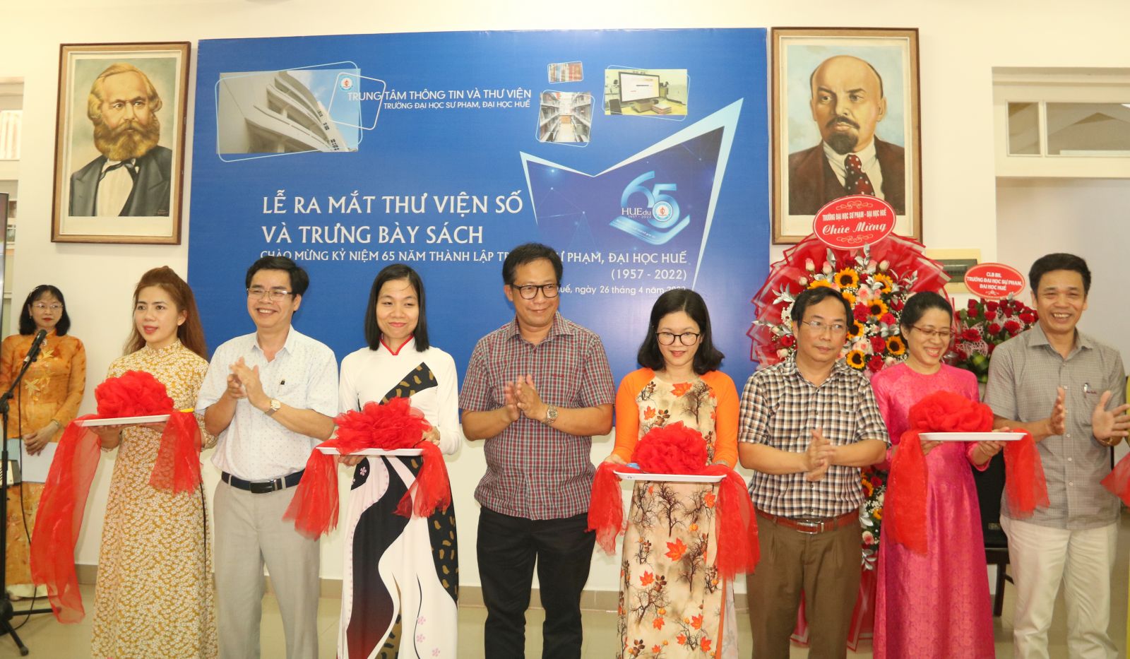Lãnh đạo Trường ĐH Sư phạm, ĐH Huế cắt băng khai mạc chương trình và ra mắt thư viện số