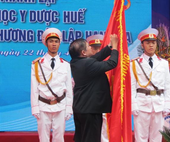 Chủ tịch UBND tỉnh Nguyễn Văn Cao thay mặt Tỉnh ủy, HĐND, UBND, UB MTTQVN tỉnh, trao tặng Trường đại học Y Dược Huế bức trướng mang dòng chữ “Tri thức và nhân ái” vì sự nghiệp đào tạo nguồn nhân lực y tế cho nước nhà