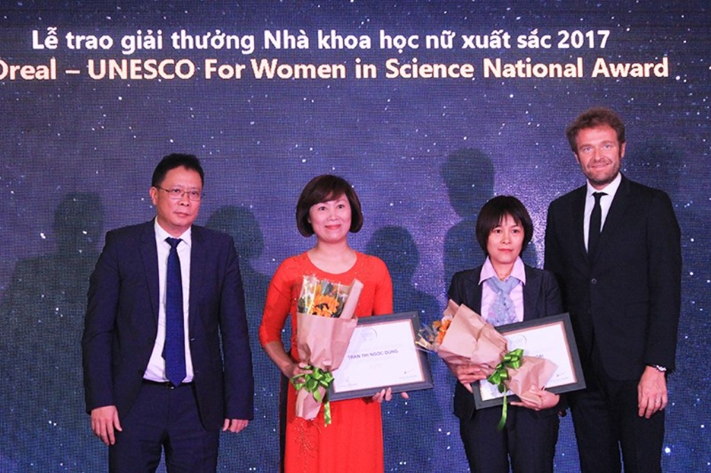 PGS.TS.Nguyễn Thị Hoài, Trưởng Khoa Dược, Trường ĐH Y Dược Huế (thứ hai, phải sang) là một trong hai nhà khoa học nữ xuất sắc nhận giải thưởng L’Oreal – UNESCO vì sự phát triển phụ nữ trong khoa học 2017.