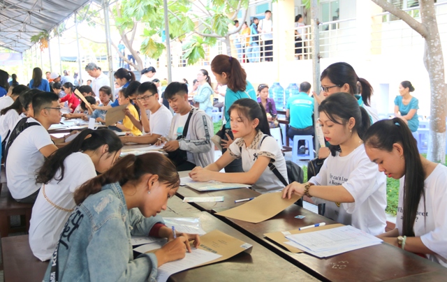 Số lượng thí sinh đông nên nhà trường chia ra nhiều khu vực theo từng khoa để tiện cho thí sinh làm các thủ tục nhập học, đồng thời bố trí khu vực đón tiếp phụ huynh.