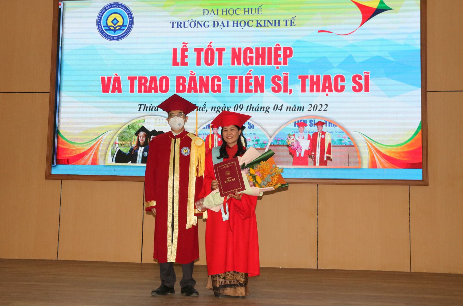 PGS.TS. Trần Văn Hòa, Hiệu trưởng Trường ĐH Kinh tế, ĐH Huế trao bằng cho tân tiến sĩ
