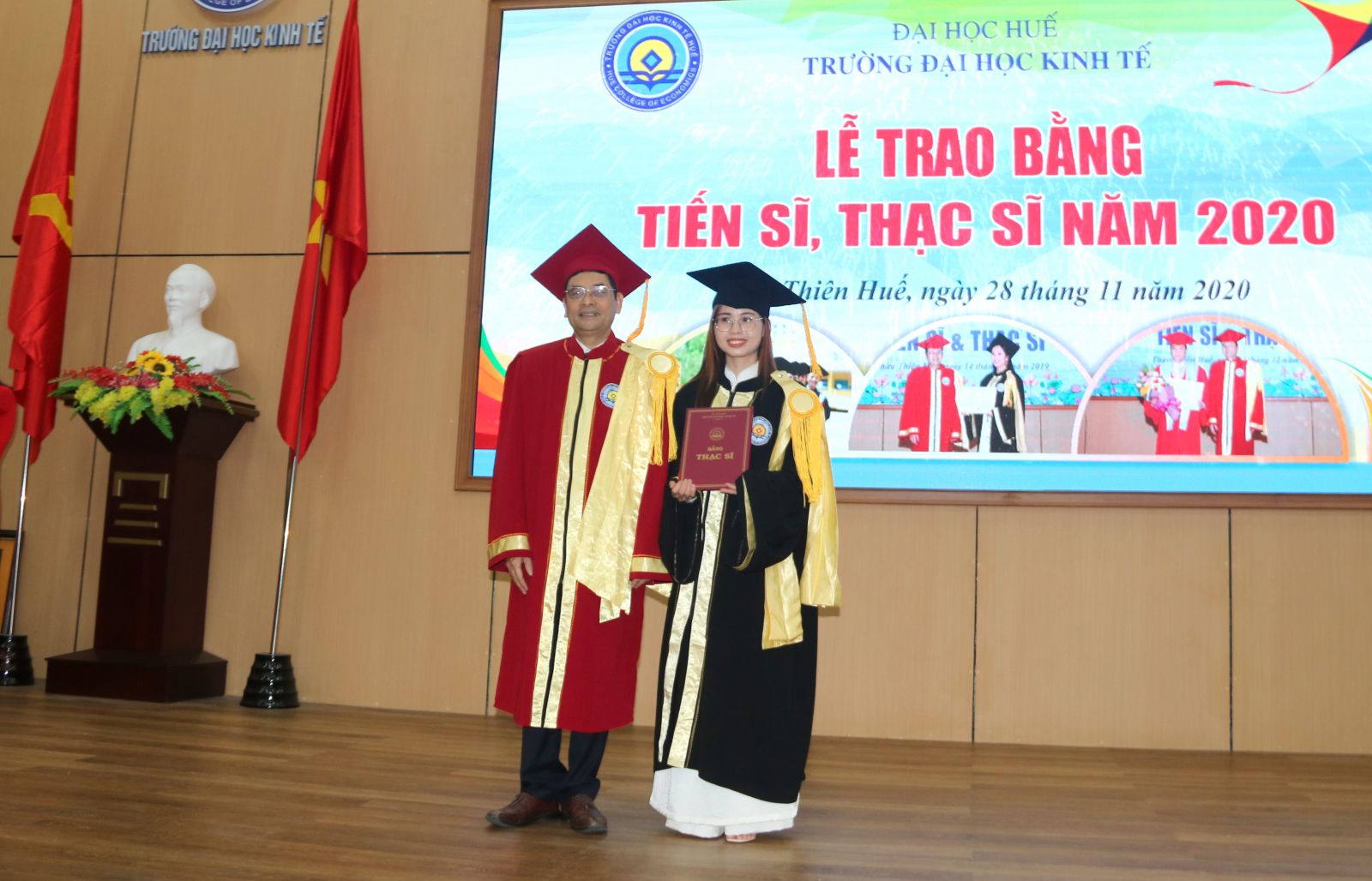 PGS.TS. Trần Văn Hòa, Hiệu trưởng Trường ĐH Kinh tế, ĐH Huế trao bằng cho tân thạc sĩ