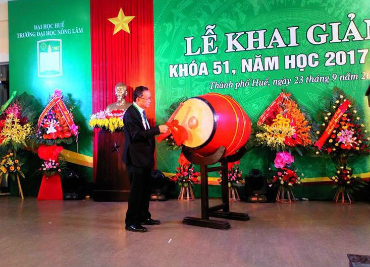 PGS. TS. Lê Văn An, Hiệu trưởng Trường ĐHNL đánh trống khai giảng năm học mới
