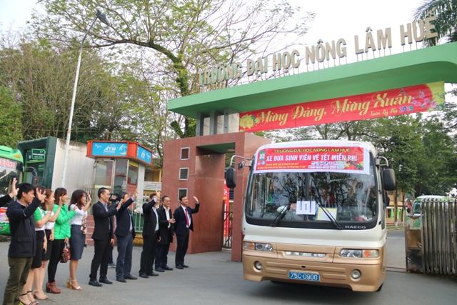 Lãnh đạo, cán bộ Trường ĐH Nông lâm và đại diện các doanh nghiệp tài trợ ra tận cổng trường để tiễn sinh viên về quê đón tết. Ảnh: H.Phúc