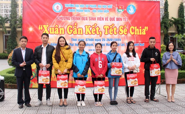 Năm nay, Trường ĐH Sư phạm, ĐH Huế hỗ trợ xe về quê cho 120 sinh viên có hoàn cảnh khó khăn, ở các tỉnh Quảng Ngãi, Quảng Nam, Quảng trị, Quảng Bình, Hà Tĩnh và Nghệ An. Ngoài ra, nhà trường còn tổ chức tặng quà tết cho các sinh viên. Tổng kinh phí là 35 triệu đồng, được vận động từ nhiều nguồn khác nhau, với sự chung tay của các tổ chức và cá nhân.