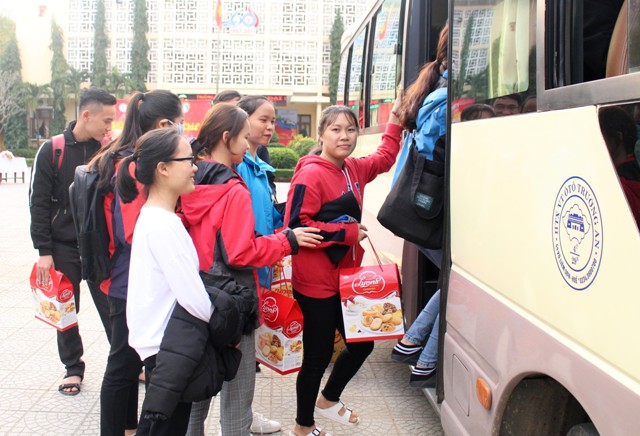 Năm nay, nhà trường tổ chức 10 chuyến xe, với tổng cộng gần 500 sinh viên được hỗ trợ xe miễn phí và được tặng quà tết.