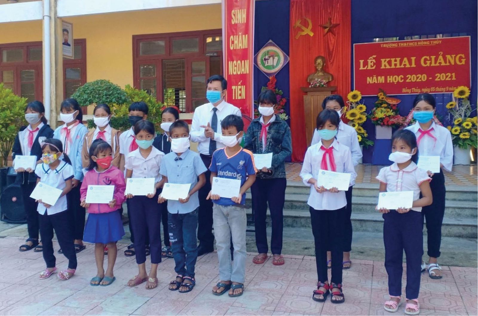 Ông Nguyễn Tân, Giám đốc Sở GD&ĐT tặng quà cho học sinh Trường tiểu học và Trung học cơ sở Hồng Thủy, huyện A Lưới. Ảnh: Hữu Phúc