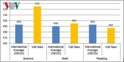 Với kết quả này, năng lực của học sinh nước ta vượt lên trên học sinh Anh (509 điểm) và Mỹ (496 điểm). Với môn Toán, Việt Nam đứng thứ 22 và tiếp tục vượt Anh, Mỹ. Tuy nhiên, khả năng Đọc hiểu của học sinh Việt Nam lại thấp hơn mức chung của thế giới (493 điểm), chỉ đạt 487 điểm, xếp thứ 32, đồng thời xếp sau hai nước kia.