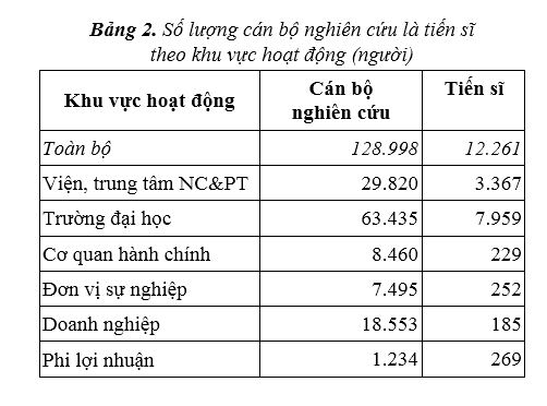 Thống kê số lượng tiến sĩ theo khu vực hoạt động cho thấy trường đại học là khu vực có số lượng tiến sĩ nhiều nhất (7.959 người, chiếm gần 65%), tiếp sau là khu vực các các viện, trung tâm NC&PT (3.367 người, chiếm gần 28%). Khu vực doanh nghiệp có tỷ lệ cán bộ nghiên cứu là tiến sĩ thấp nhất.