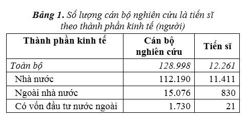 Cũng theo kết quả tổng hợp của các cuộc điều tra trên, số lượng cán bộ nghiên cứu có trình độ tiến sĩ chủ yếu tập trung ở khu vực nhà nước (11.411 người trên tổng số 12.261 người, chiếm 93%), tiếp đến là khu vực ngoài nhà nước (830 người, chiếm 6,8%) và còn lại là khu vực có vốn đầu tư nước ngoài. Trong tổng số 12.261 tiến sĩ, có 3.637 tiến sĩ là nữ, chiếm gần 30%. Chủ yếu số nữ tiến sĩ làm việc trong khu vực nhà nước (3.198 người, chiếm gần 88%).