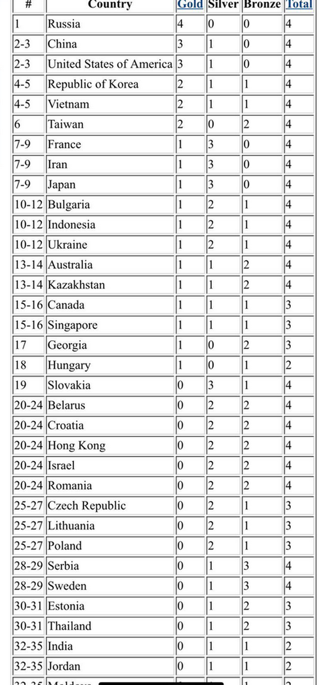 Với thành tích này, đoàn học sinh Việt Nam và Hàn Quốc đứng thứ 4 trên bảng xếp hạng các nước tham dự, đứng đầu cuộc thi là Nga, Trung Quốc và Mỹ.