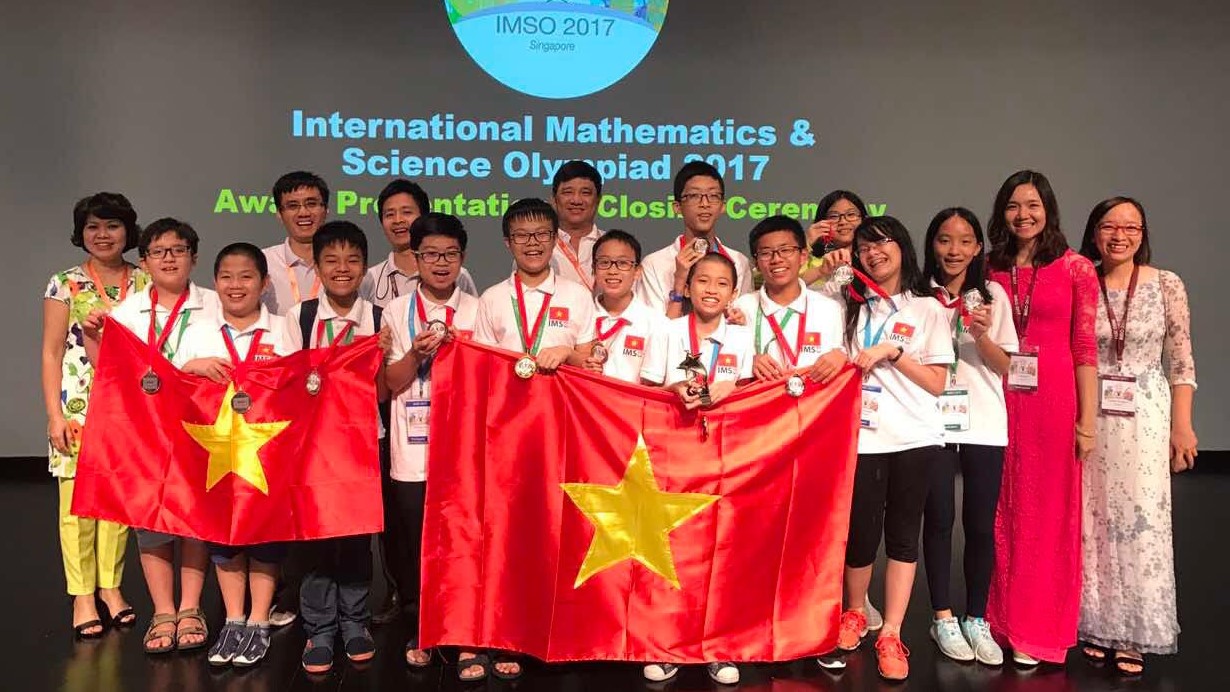 Các thành viên đội tuyển Việt Nam tham dự kỳ thi Toán và Khoa học quốc tế 2017 (IMSO 2017) vừa giành được 12/12 huy chương, trong đó có 1 huy chương Vàng đầu tiên của nội dung Khoa học sau nhiều năm tham dự.
