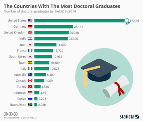 Theo đó, xếp thứ nhất là Hoa Kỳ với 67.449 người tốt nghiệp tiến sĩ trong năm 2014, gấp đôi so với đối thủ “sát nách” là Đức với 28.197 người.