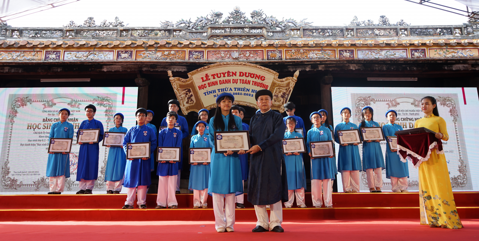 “Học sinh danh dự toàn trường” là danh hiệu cao quý mà mỗi trường học chỉ có 1 học sinh được tuyên dương tại Quốc Tử Giám - Huế. Việc chọn Quốc Tử Giám làm địa điểm tổ chức tuyên dương khen thưởng học sinh danh dự toàn trường hàng năm nhằm giáo dục cho học sinh lòng tự hào, trách nhiệm trong học tập, rèn luyện.