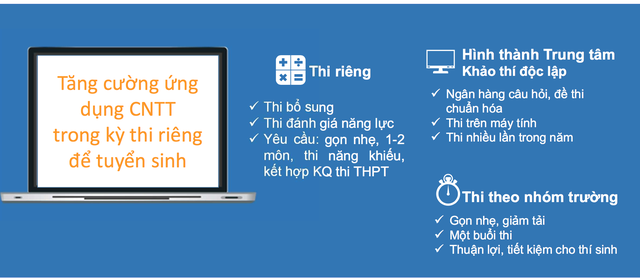 Ngoài ra, để chuẩn bị các điều kiện để tiến tới thi trên máy tính, bà Nguyễn Thu Thủy, Vụ trưởng Vụ Giáo dục đại học cho biết, bộ tăng cường ứng dụng công nghệ thông tin để tuyển sinh, Bộ GD-ĐT đang nghiên cứu hình thành Trung tâm khảo thí độc lập để tuyển sinh, trong đó, xây dựng ngân hàng câu hỏi, đề thi chuẩn hóa, thi trên máy tính và thi nhiều lần trong năm.