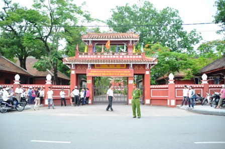| Công an bảo vệ vòng ngoài tại điểm thi Trường Quốc Học |