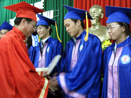 PGS.TS.Lê Văn Anh, Phó Giám đốc Đại học Huế phát bằng tốt nghiệp cho các tân cử nhân hệ chính quy ngành Vật lý đào tạo theo chương trình tiên tiến khoá 2006-2010