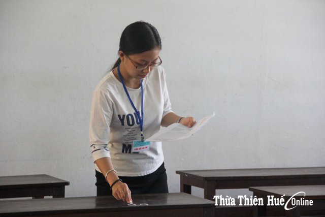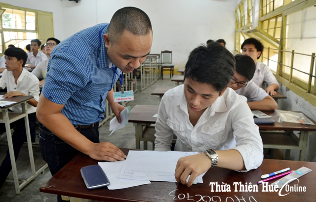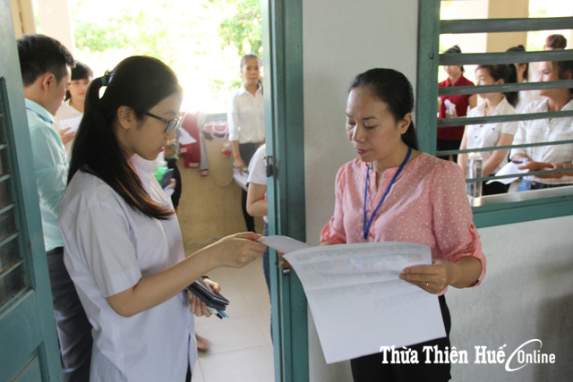 Cán bộ coi thi ở điểm thi Trường ĐH Kinh tế - ĐH Huế kiểm tra thẻ dự thi của TS (Ảnh: Hữu Phúc)