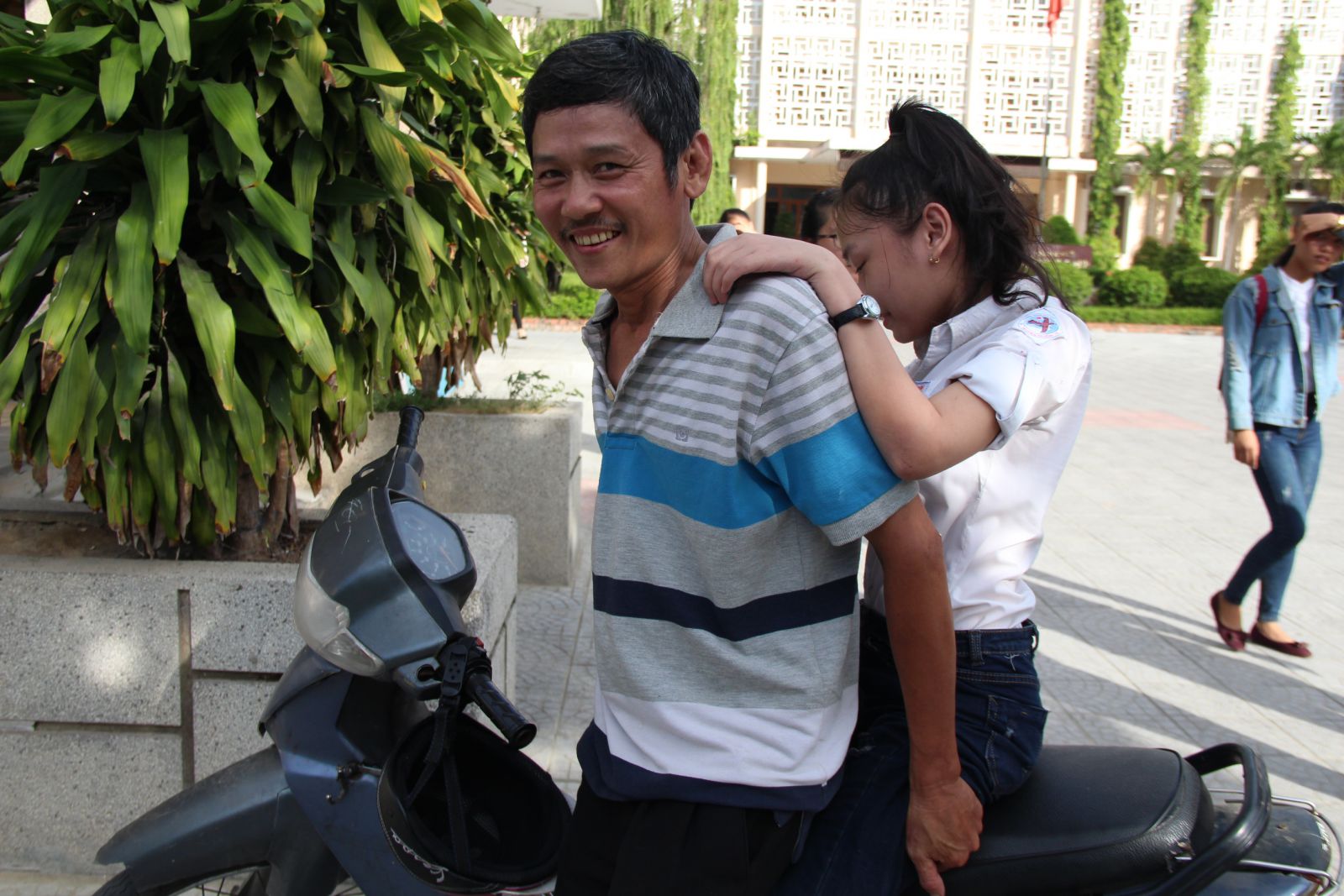 Thanh được ba đưa về bằng xe máy sau khi kết thúc mỗi môn thi