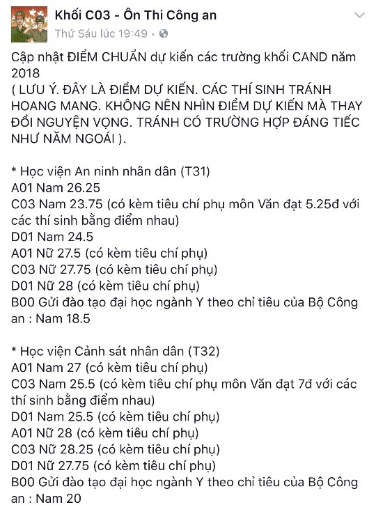 Điểm chuẩn dự kiến vào khối trường công an trên mạng xã hội là không chính xác