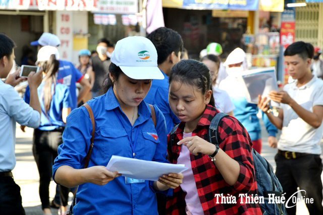 Sáng 30/6, tại trường Đại học sư phạm Huế, hơn 70 tình nguyện viên (TNV) trong đội Tiếp sức mùa thi đã có mặt từ sớm để hướng dẫn, hỗ trợ hàng trăm thí sinh đến tập trung làm thủ tục và nhận giấy báo dự thi.