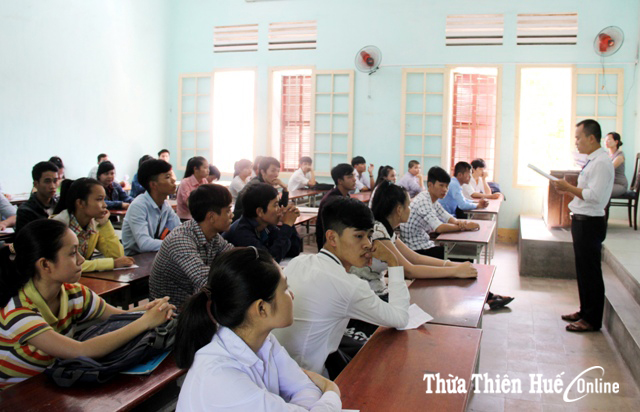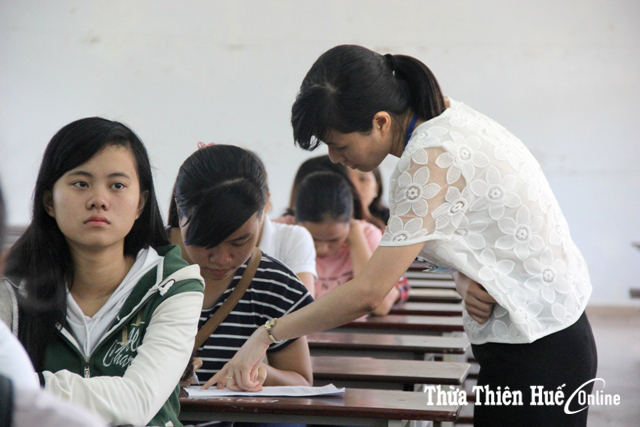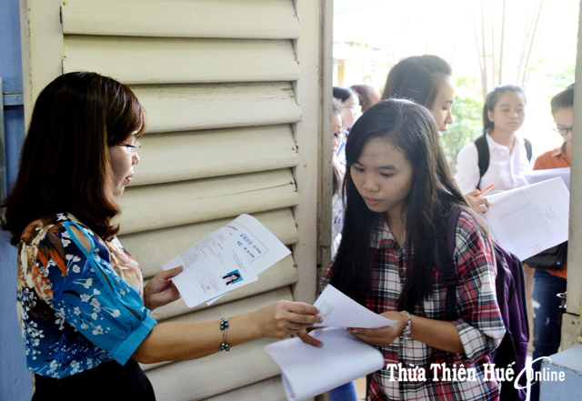 Sau khi cán bộ coi thi gọi TS vào phòng, các em được phổ biến quy chế thi, kiểm tra thẻ dự thi và điều chỉnh những sai sót (nếu có). Hầu hết TS sau khi làm thủ tục đều nắm vững thông tin cần thiết và có tâm lý thoải mái. Đặng Thị Hoàng Anh, dự thi ở điểm Trường ĐH Khoa học – ĐH Huế tự tin: “Em đỡ lo rồi. Các cô thầy nhắc nhở quy chế rất kỹ”.