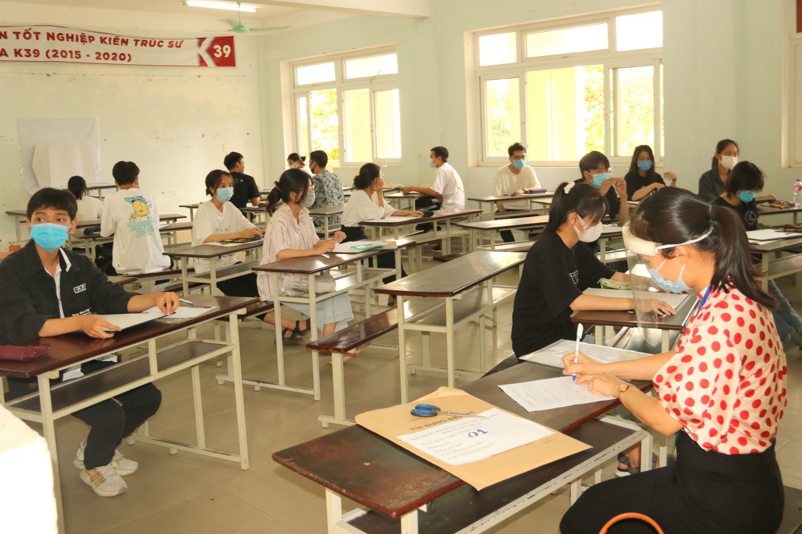 Để đảm bảo an toàn trong phòng, chống dịch COVID-19, tất cả thí sinh đều được đo thân nhiệt, rửa tay sát khuẩn, đeo khẩu trang. Mỗi phòng thi bố trí ngồi giãn cách. Cán bộ coi thi được trang bị mũ chống giọt bắn.