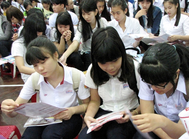 Học sinh tìm hiểu thông tin về các trường ĐH, CĐ tại chương trình tư vấn "Đưa trường học đến thí sinh năm 2015" được tổ chức tại Trường THPT Quốc Học ngày 15/3/2015