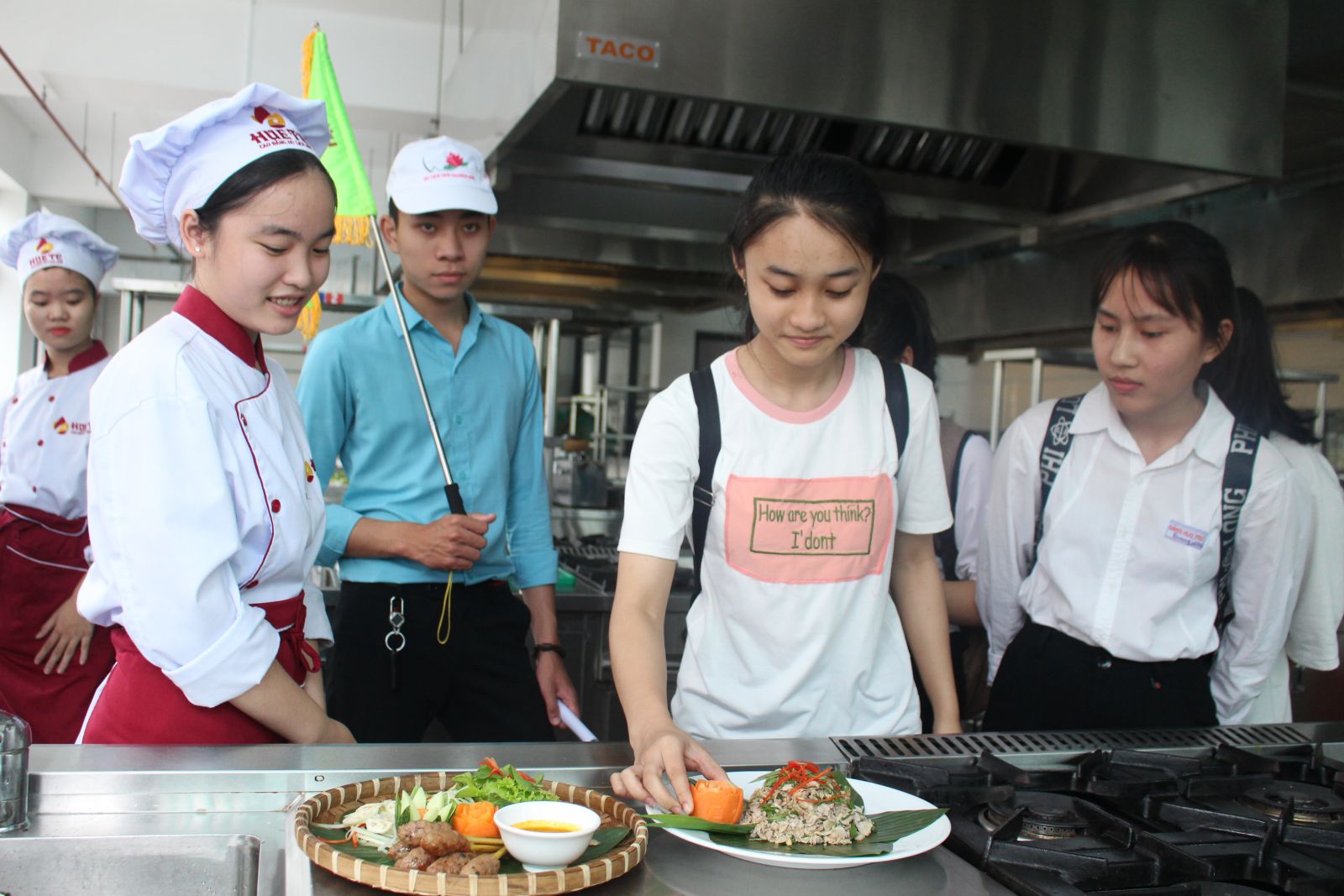 Theo đó, học sinh được mặc đồng phục bếp, “thử sức” cắt tỉa, học hỏi nấu nướng, cách pha chế đồ uống, hoặc “du lịch” 4D, chơi đố vui về tiếng Anh du lịch…giúp học sinh có những cái nhìn tổng quát về nghề du lịch khách sạn.