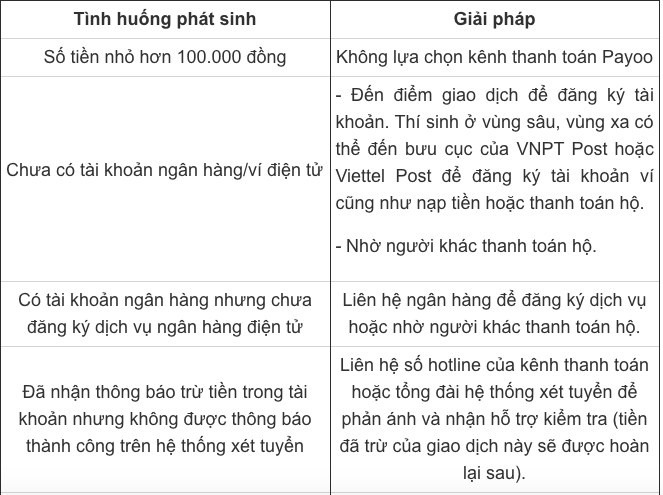 Dưới đây là một số tình huống phát sinh và giải pháp cho thí sinh trong quá trình nộp lệ phí xét tuyển đại học trực tuyến: