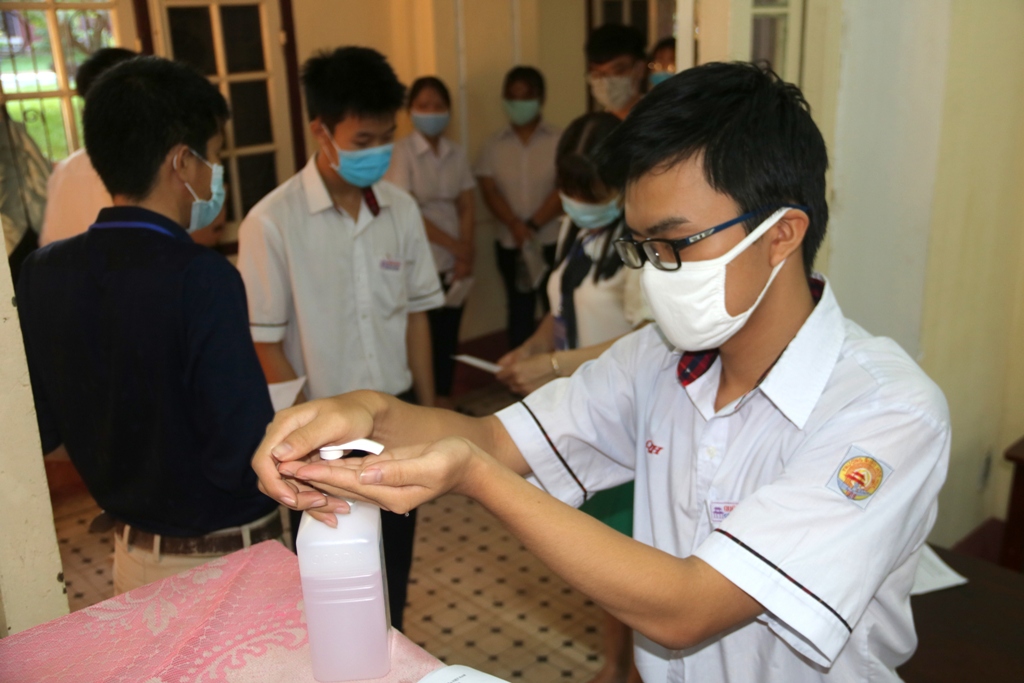 Tại điểm thi Trường THPT Chuyên Quốc học, thí sinh được yêu cầu rửa tay sát khuẩn khi vào phòng thi