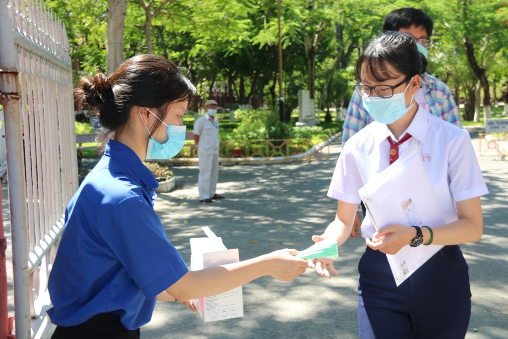 Lực lượng tình nguyện viên tại điểm thi Trường THPT Hai Bà Trưng phát tặng khẩu trang cho thí sinh