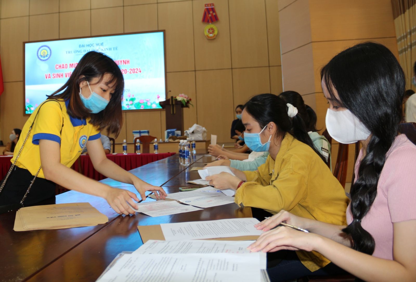 HNN.VN - Sáng 30/8, Trường đại học (ĐH) Kinh tế, ĐH Huế tổ chức tiếp đón những tân sinh viên khóa 54 đầu tiên trúng tuyển theo diện ưu tiên xét tuyển thẳng; riêng thí sinh từ các vùng dịch được hướng dẫn nhập học trực tuyến.