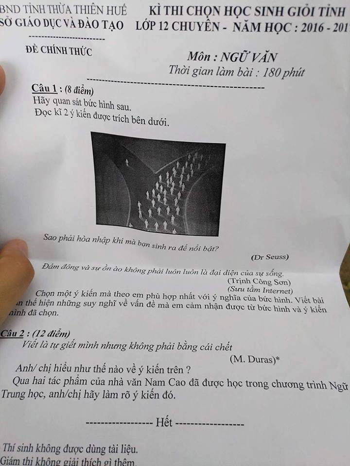 Đề thi môn Ngữ văn với thời gian làm bài 180 phút của tỉnh Thừa Thiên Huế được đăng tải trên một diễn đàn học văn. Cả hai câu hỏi 8 điểm và 12 điểm của đề đều thu hút sự quan tâm của những người yêu văn.
