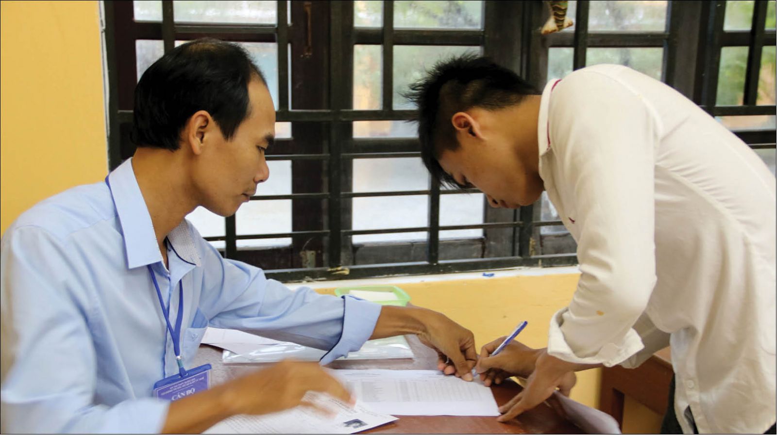 Làm thủ tục phát thẻ dự thi cho thí sinh tự do (Ảnh: Hữu Phúc)