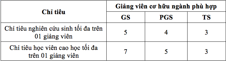 Chỉ tiêu tuyển sinh thạc sĩ tối đa theo ngành của cơ sở giáo dục đại học được tính bằng quy mô đào tạo tối đa theo năng lực đội ngũ giảng viên cơ hữu ngành phù hợp. Số lượng nghiên cứu sinh, học viên cao học tối đa trên 01 giảng viên cơ hữu được tính như sau: