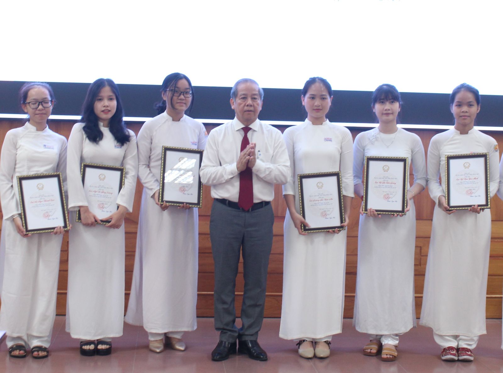 Hồ Thị Kiều Trang (thứ hai bên phải) tại lễ tuyên dương học sinh đạt thành tích cao trong kỳ thi THPT quốc gia 2019 của UBND tỉnh