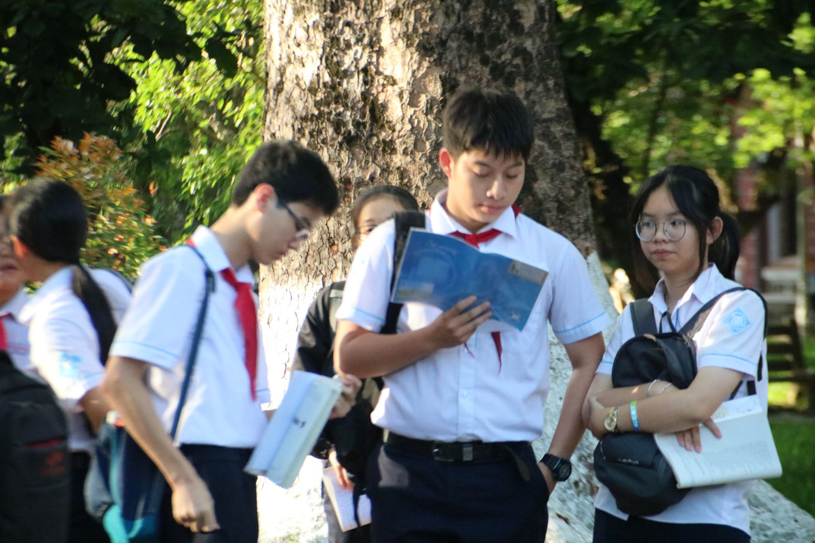 Xem lại bài trước khi thi tại Hội đồng thi Trường THPT chuyên Quốc Học Huế . Ảnh: Hữu Phúc