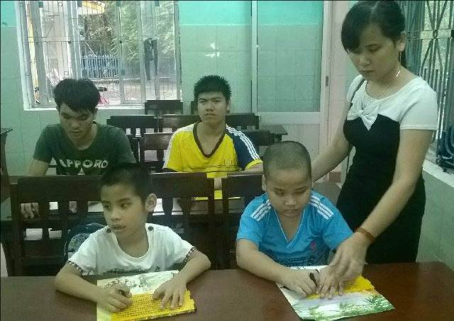 Cô giáo Yến Anh hướng dẫn các em học chữ braile