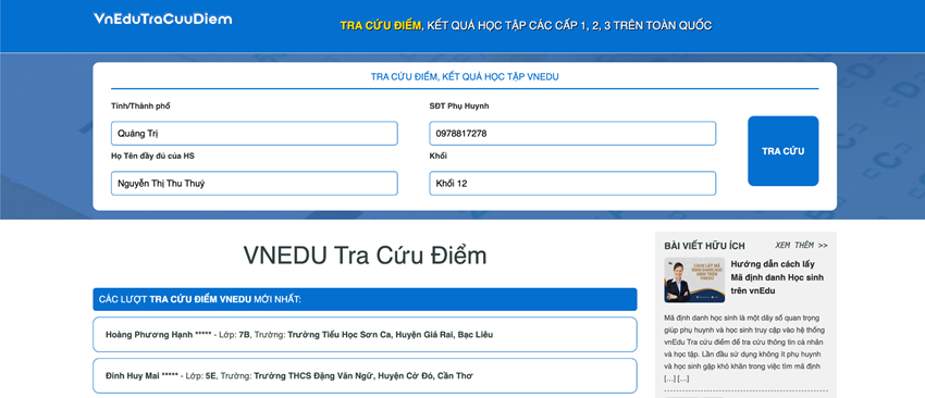 | Giao diện khi truy cập vnEduTraCuuDiem.com để tra cứu điểm |
