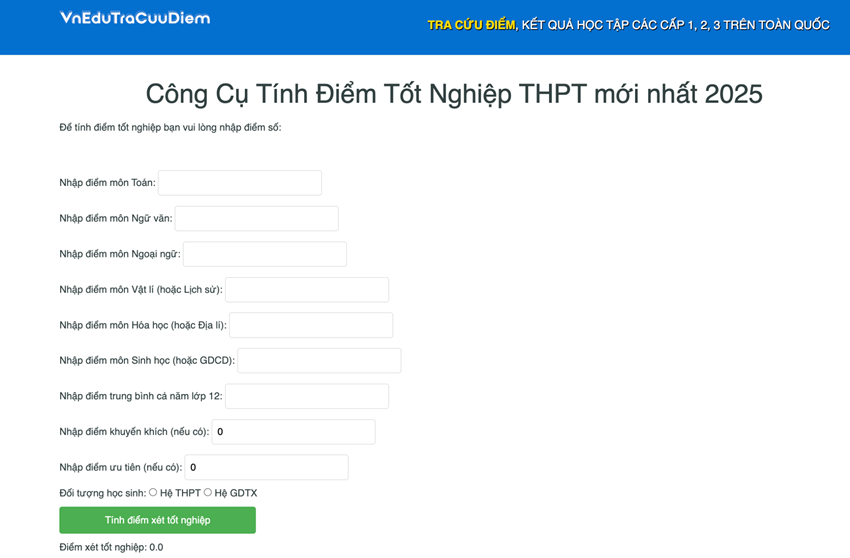 | Nhập điểm các môn học để tính điểm thi tốt nghiệp THPT tự động |