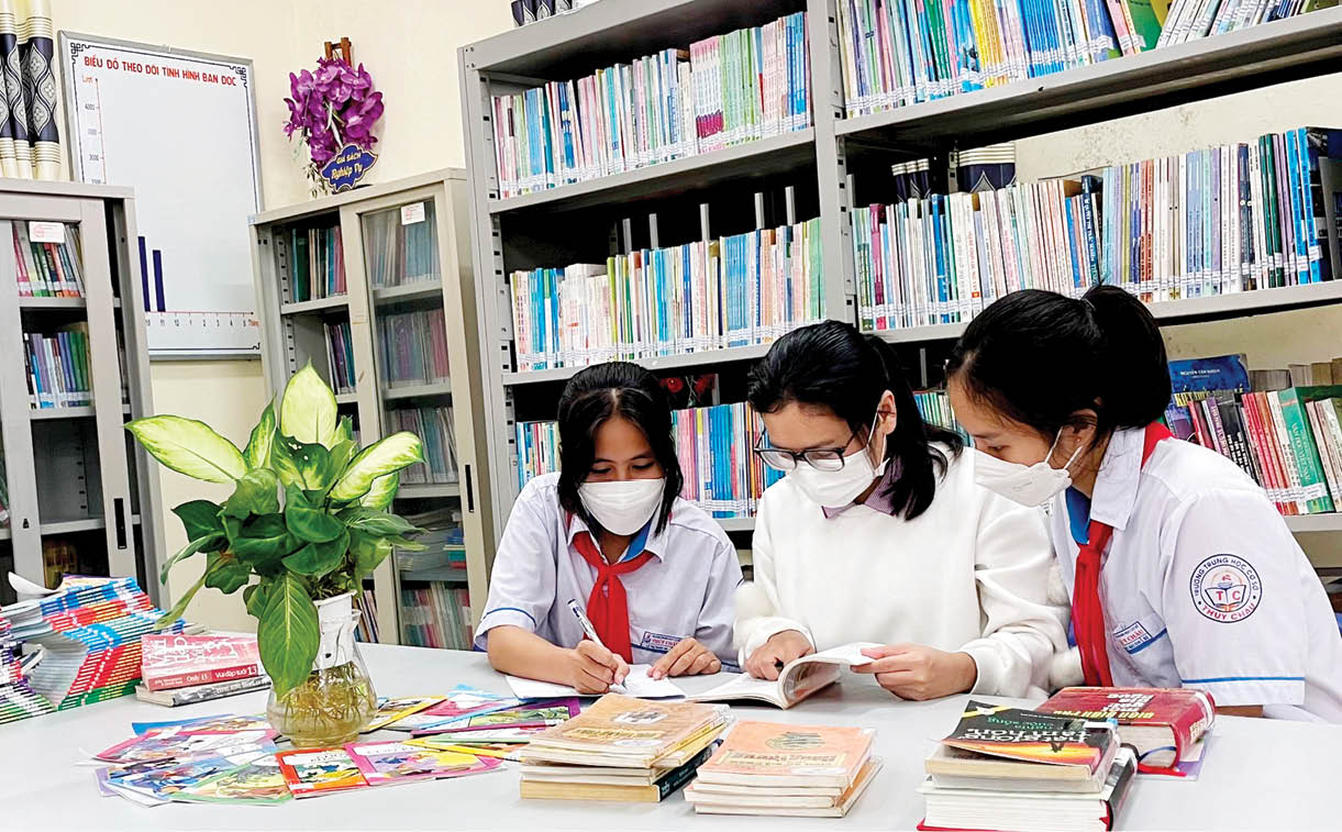 Cô Cẩm Nhung (giữa) và 2 học sinh cùng tìm hiểu, nghiên cứu tư liệu trong quá trình thực hiện đề tài