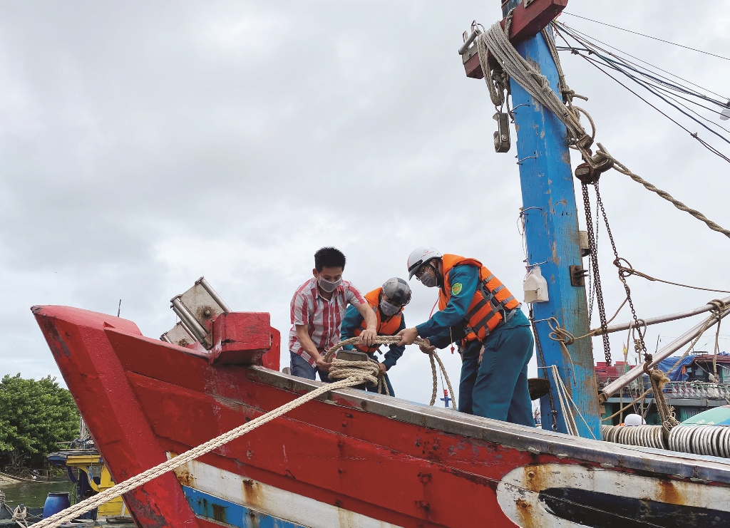 Dân quân xã Phú Hải (huyện Phú Vang) giúp các ngư dân neo đậu tàu tránh bão